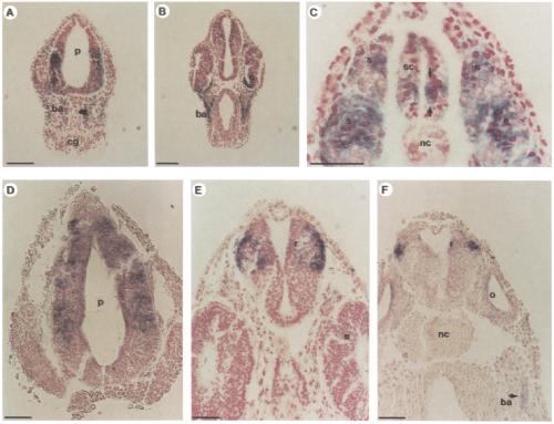 rhombencephalon; s, somite; SC, spinal cord. Bars are 1OOpm (A,B) or 50pm (C-F).