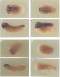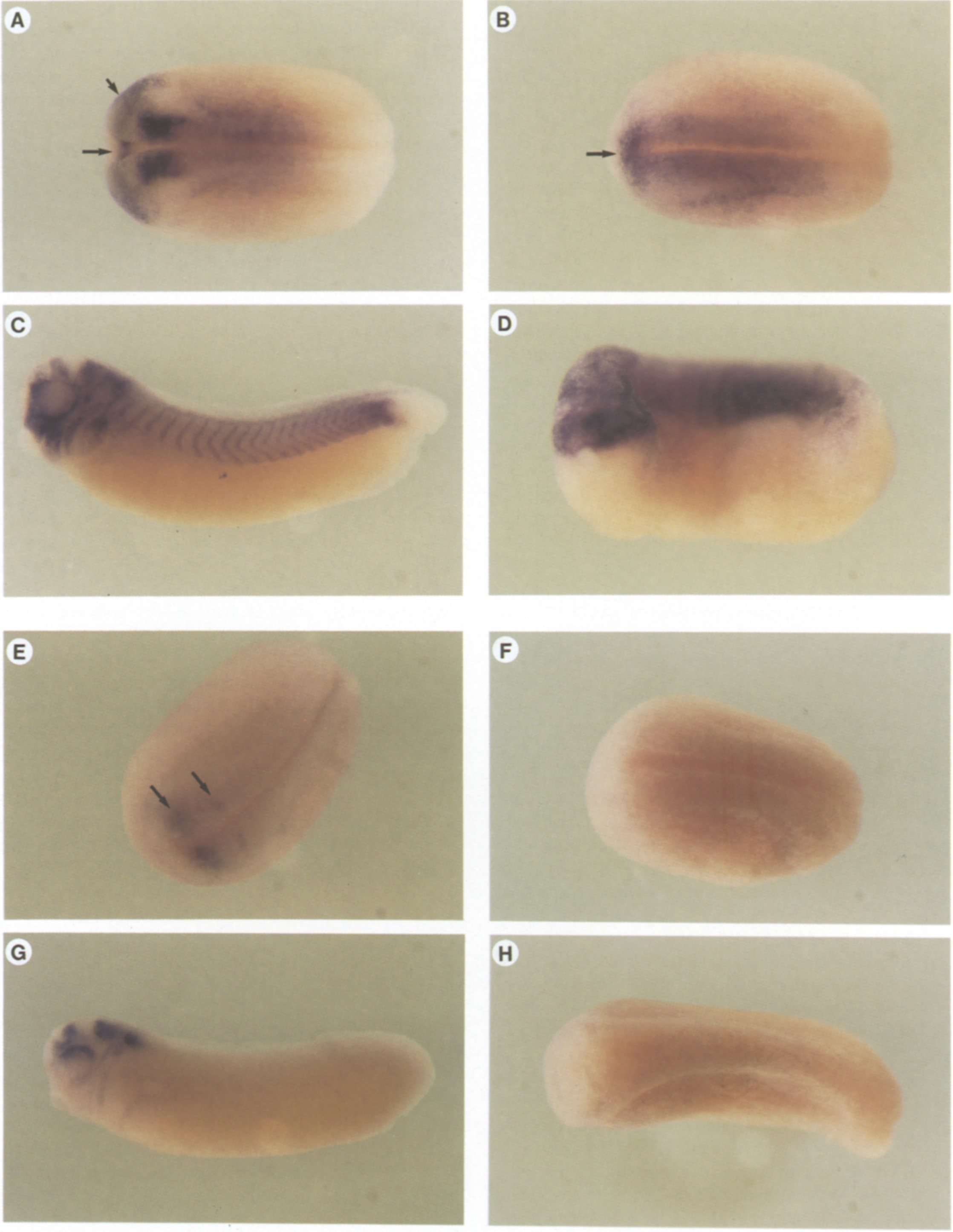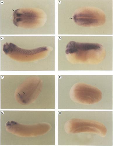 Fig. 4. Whole mount in situ hybridization with an antisense xCOUP-TF-A RNA probe (A-D) and an antisense xCOUP-TF-B RNA probe (E-H). (A)