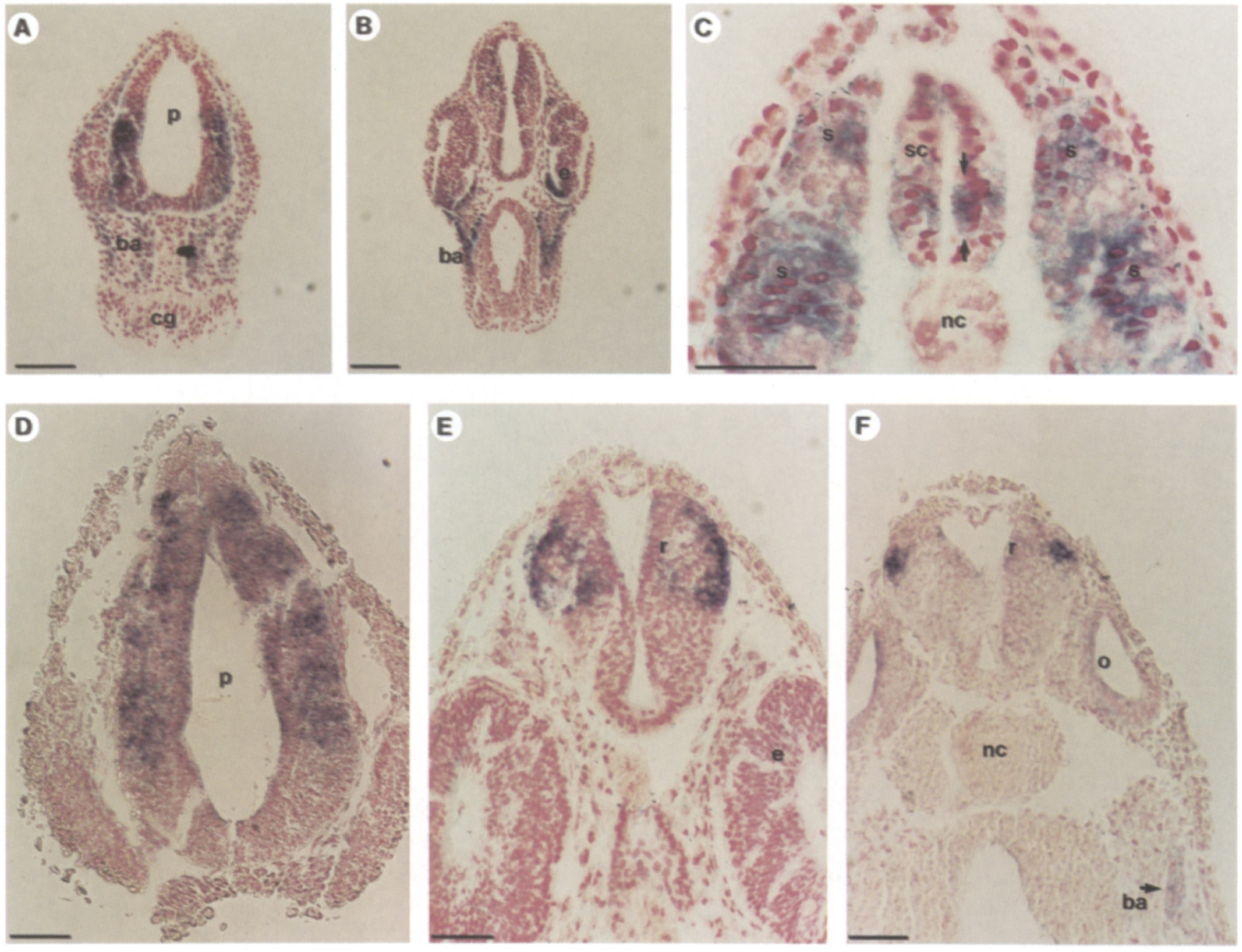 in the ventral part of the spinal cord (arrows) and in the somites. (E) Section through the eyes and the hindbrain; neural staining is in rl . (F)
