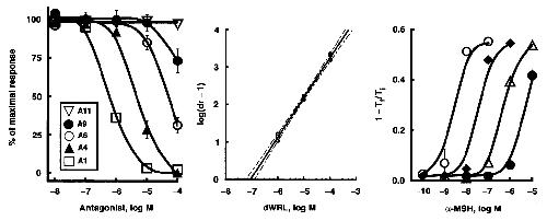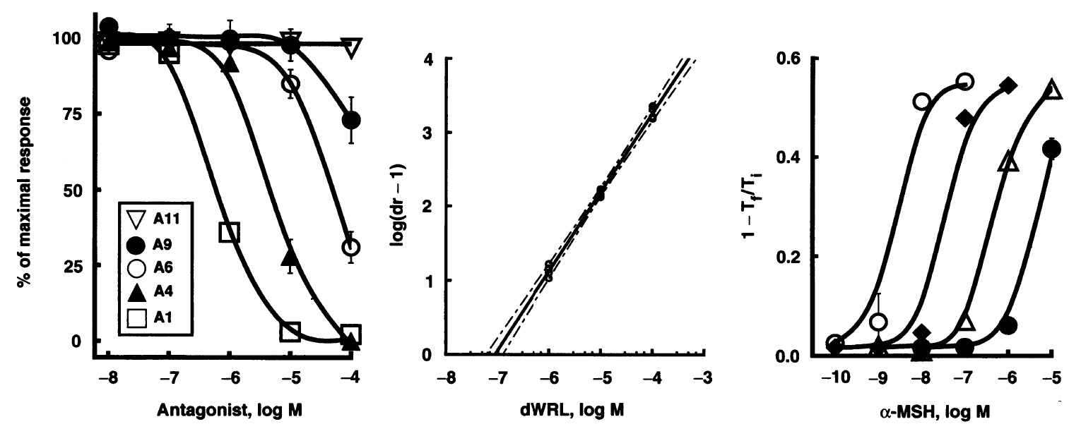 Competitive inhibition of a-MSH by D-Trp-Arg-Leu-NH2 (dWRL) is demonstrated by using Schild regression analysis (28). The negative logarithm