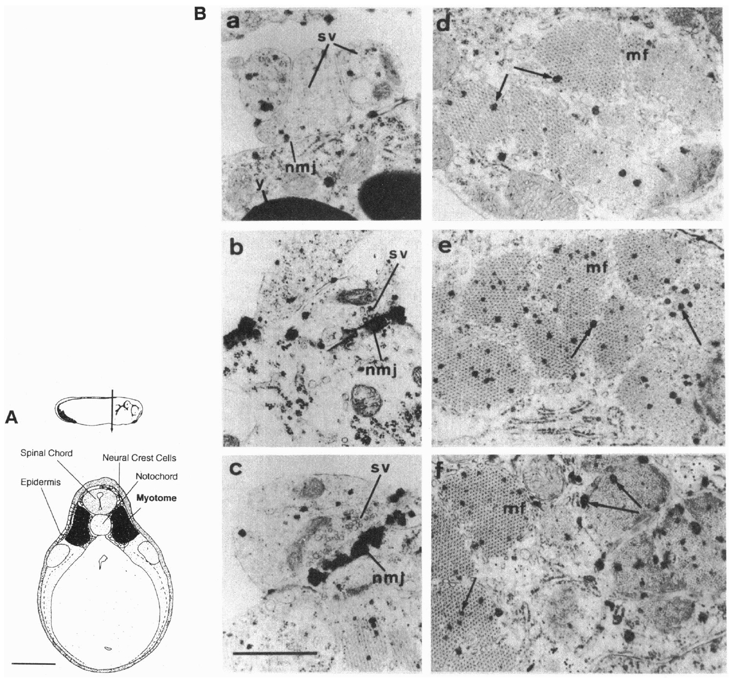 electron microscopy was employed to detect high-density accumulations of thiocholine reaction product in myotome areas (shaded). (Diagrams