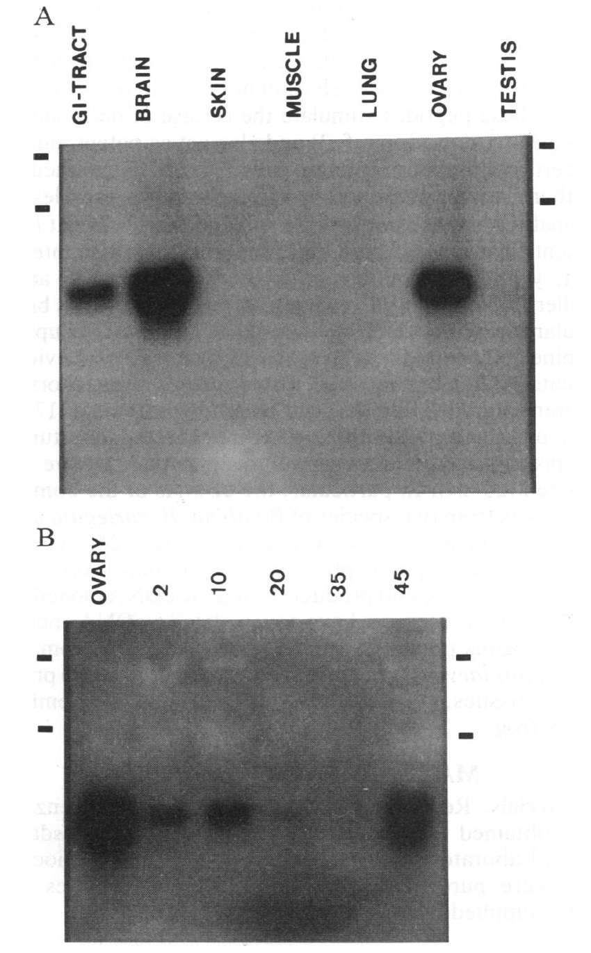 A cDNA encoding the precursor of a bombesinlike peptide was isolated from brain of Xenopus laevis. The predicted end product resembles neuromedin B, which was originally isolated from mammalian spinal cord. The mRNA for this precursor was also present in gastrointestinal tract and in ovaries. Moreover, it could be detected in early embryos (stage 2 and stage 10) of X. laevis. These findings suggest novel roles for peptides of the bombesin family in oocyte maturation and early amphibian development.