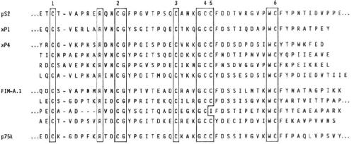 signal peptidase is indicated by an arrow. 'fhe conserved tryptophan residue in the P-domain is encircled, and the