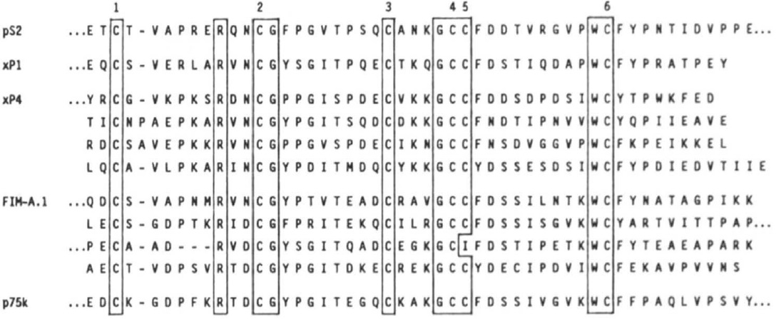 Two different precursors for secretory polypeptides from the stomach of Xenopus laevis have been characterized by cDNA cloning. Both mature polypeptides are potential candidates for gastrointestinal growth factors. One, xP1, is the X. laevis homologue of the pS2 gene product consisting only of a single P-domain, whereas the second, xP4, is a novel polypeptide formed by four P-domains arranged in tandem. Northern analysis detected both transcripts in the stomach but not in the skin or the brain. In situ hybridizations localized the expression of both precursors in surface mucous cells of the gastric mucosa. With an antibody generated against the deduced C-terminal end of xP4, the mature polypeptide was investigated by Western analysis revealing N-glycosylation of xP4.