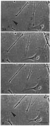 cell b. (C) The growth cone of fibre 1 has collapsed 8min