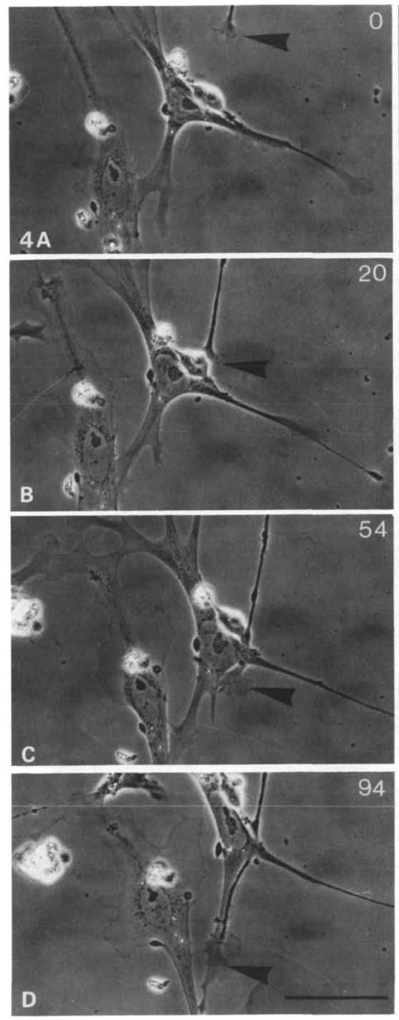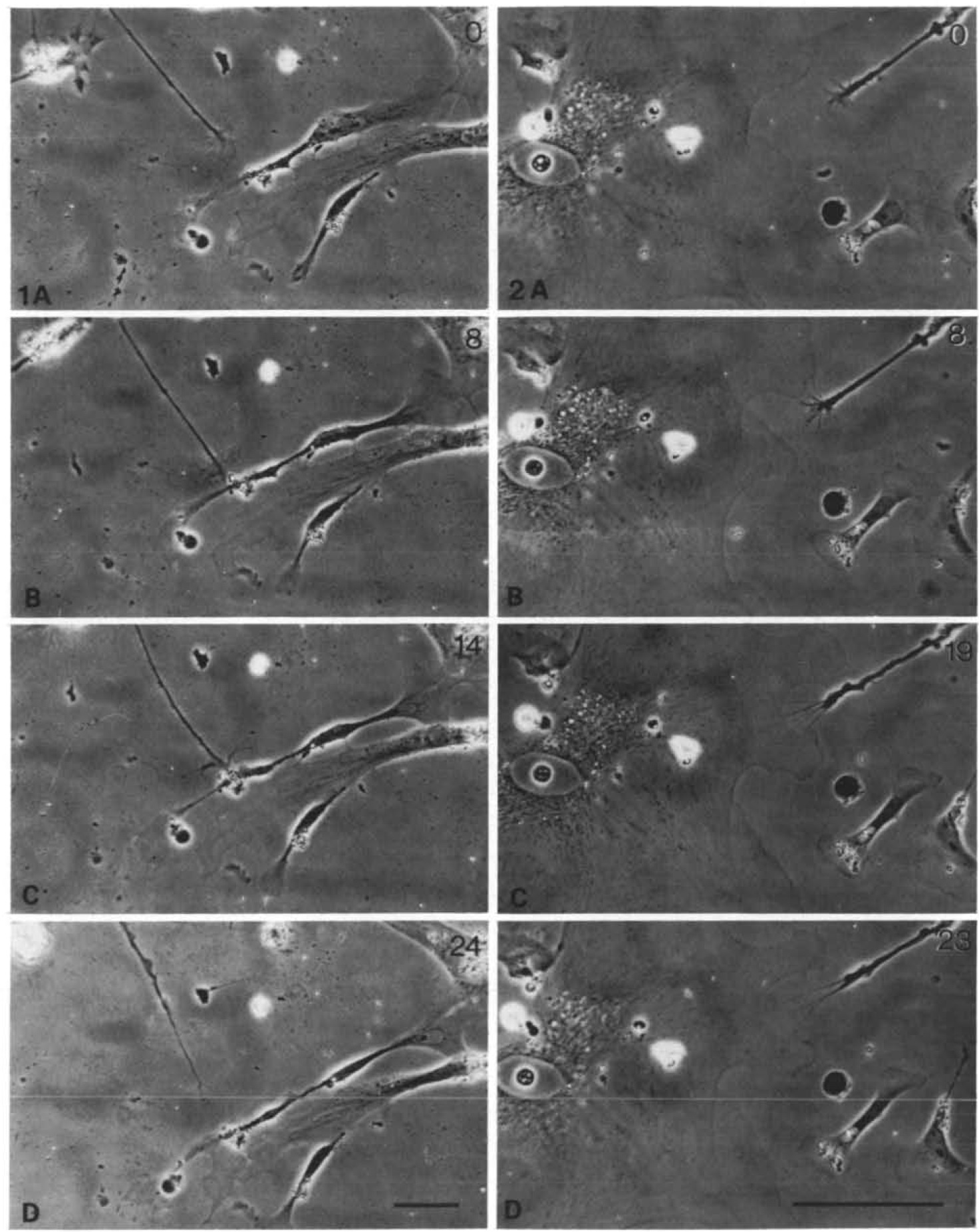 Figs 1 and 2. Sequences of photographs of temporal retinal growth cones contacting caudal tectal glial cells. The numbers at the top right of each photograph refer to the time in minutes since the sequence started. Fig. 1A-D. Temporal growth cone (A) advancing, (B) contacting, (C) collapsing and (D) retracting from an elongated caudal tectal glial cell. Scale bar represents 50/im. Fig. 2A-D. Temporal growth cone contacting and retracting from a highly flattened glial cell. Scale bar represents 50um.