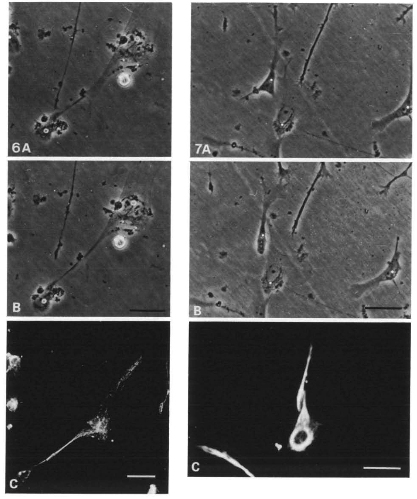 Figs 6 and 7. Temporal growth cones collapsing and retracting from caudal tectal glial cells. After retraction, the cultures
