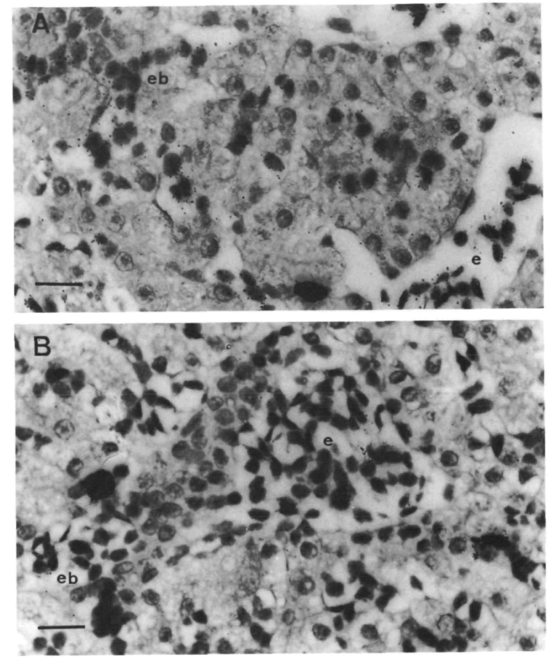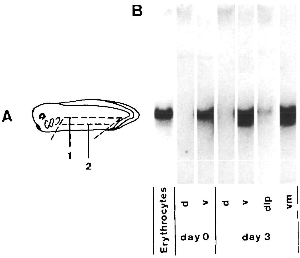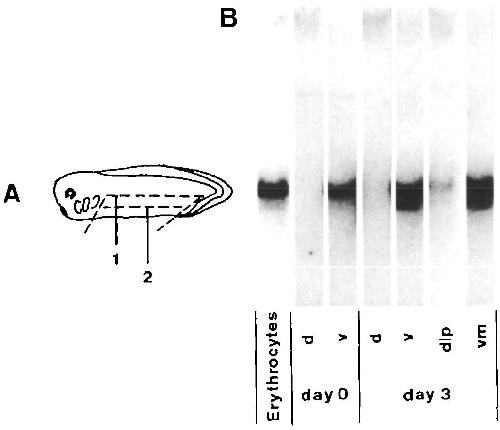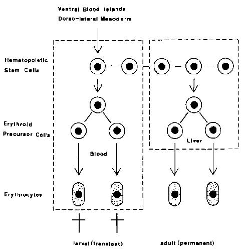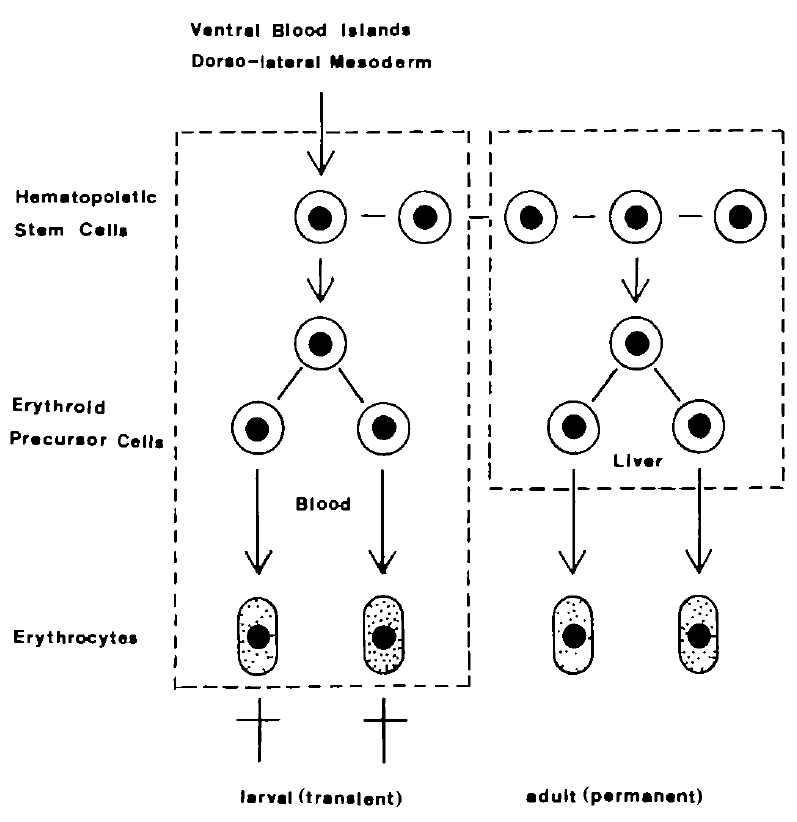 The transition of hemoglobins during metamorphosis of Xenopus laevis involves replacement of the larval erythrocytes by adult ones, suggesting that the developmental control of this event depends upon the growth characteristics of the precursor cells. To identify the erythroid precursor cells and to investigate their developmental fate, we analyzed the distribution of stage-specific globin mRNAs by northern blotting in dorsal and ventral fragments of stage 32 embryos after in vitro culture as well as presumptive erythropoietic tissues of tadpoles during metamorphosis. The histological analysis shows that erythrocytes differentiate only in ventral fragments, suggesting that the ventral blood islands and most likely also the dorsolateral mesoderm are the primary sites of erythropoiesis. We also demonstrate that the first generations of erythrocytes, already express the predominating larval-specific alpha-globin mRNAs. The globin mRNA patterns obtained from presumptive erythropoietic tissues suggest an important role of circulating precursor cells in larval erythropoiesis, whereas the liver appears to be the main site of formation and maturation of the adult erythrocytes. Tentatively we propose that anuran erythropoiesis is dependent upon a self-perpetuating stem-cell line and that the larval and the adult erythrocytes are derived from successive generations of erythroid precursors, whose commitment may be imposed by the erythropoietic sites.