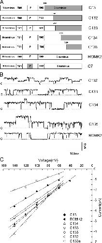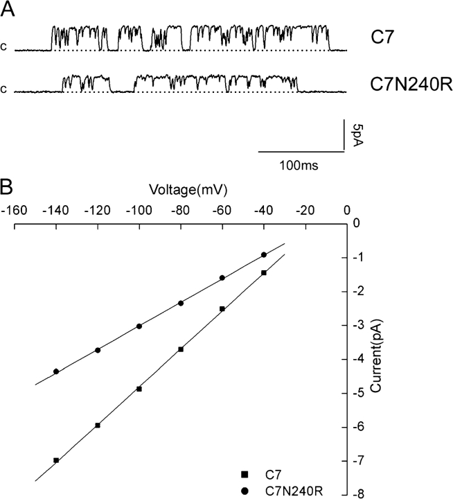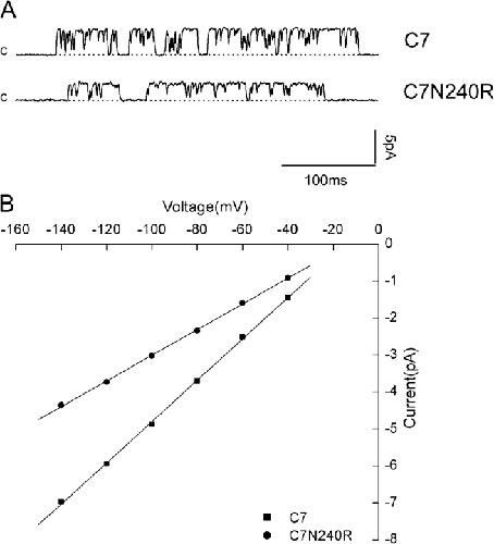 Figure 8. . Effects of the N240R mutation on a channel with a higher conductance of the selectivity filter. (A) Single-channel traces for C7 chimera and C7 N240R with a holding potential of −80 mV. (B) I–V relationships for C7 and N240R. Single-channel conductances were C7, 58 pS, and C7 N240R, 36 pS. |