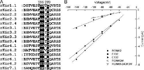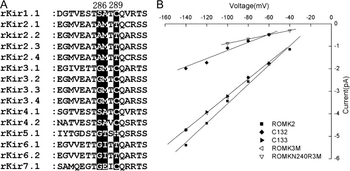 Figure 3. . Effects of triple point mutations S286AA287M C289T (ROMK3M) on single-channel conductance of ROMK2. (A) Alignment of sequences of the Kir family in the region between residues 279 and 294 of ROMK2. (B) I–V relationships of ROMK2, C133 (in which the region in A is derived from IRK1), and the triple mutation S286AA287MC289T (ROMK3M) in which three of the residues of ROMK2 are mutated to the corresponding residues of IRK1, and the combined ROMK3M + N240R mutant. For comparison the I–V relationships of ROMK2 and C133 from Fig. 1 are superimposed. Slope conductances measured between −40 and −140 mV were ROMK2, 43 pS; C133, 37 pS; ROMK3M, 37 pS; ROMK3M N240R, 10 pS; C132, 18 pS. |