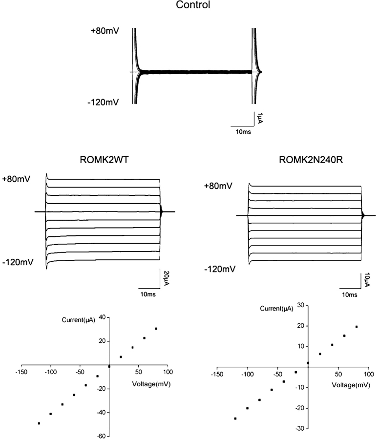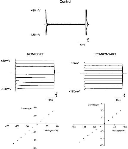Figure 5. . Macroscopic current–voltage relationships for ROMK2 and N240R. Above, current traces for an uninjected (control) oocyte. Steady-state currents were <200 nA. Middle, current traces measured with two-electrode voltage clamp in oocytes expressing ROMK2 and N240R. The extracellular K concentration was 110 mM. The membrane voltage was held at 0 mV and stepped to values between −120 and +80 mV for 50 ms. Below, steady-state I–V relationships. |
