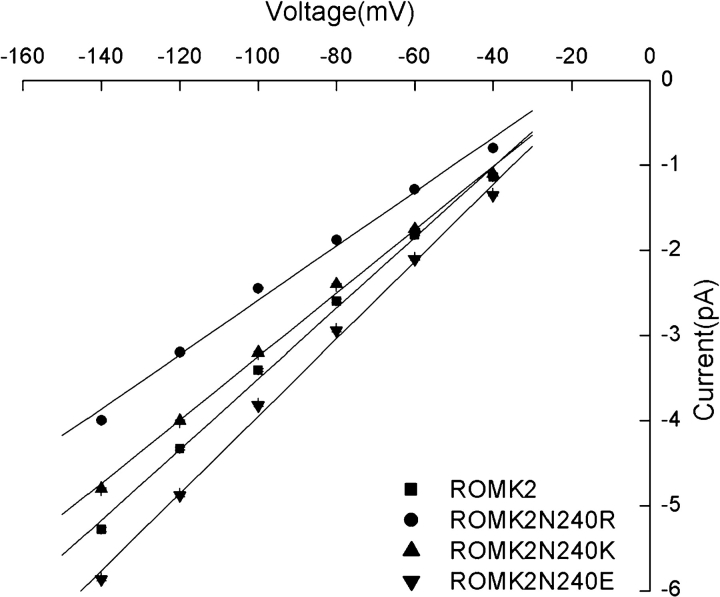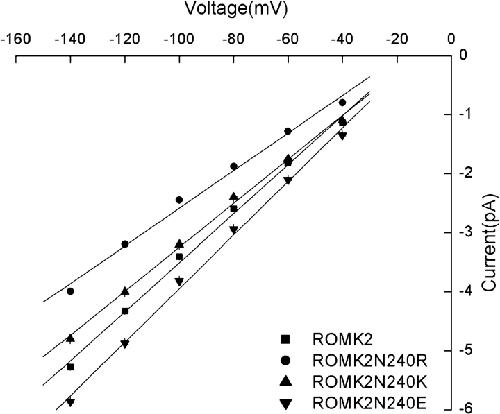 Figure 9. . Effect of charge at position 240 on single-channel conductance. Conductances measured between −40 and −140 mV were ROMK2, 43 pS; C13, 31 pS; N240R, 31 pS; N240K, 37pS; and N240E, 45pS. |