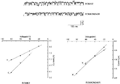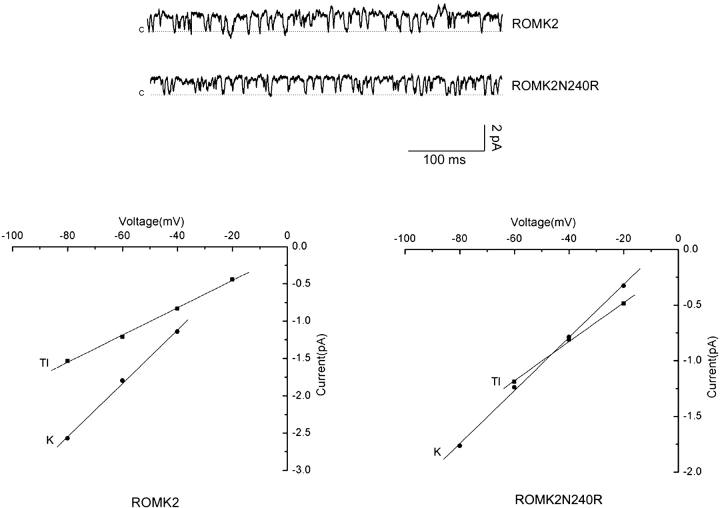 Figure 10. . Tl+ conductance and selectivity. Above, single-channel currents recorded in cell-attached patches with 110 mM Tl+ in the pipette and a holding potential of −60 mV. Below: I-V relationships for K+ and Tl+ conductance in wild-type ROMK2 and N240R mutant channels. The single-channel conductances for Tl+ were 18 pS in both channels. The Tl+:K+ conductance ratios were 0.51 for ROMK2 and 0.78 for N240R. |