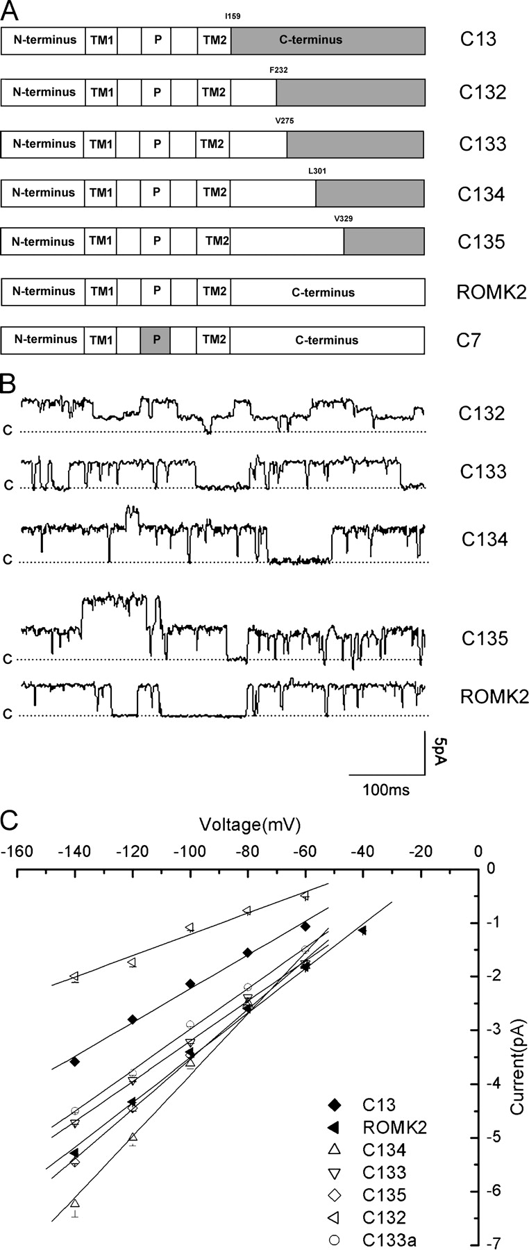 Figure 1. . Single-channel conductance and ROMK2/IRK1 chimeras. (A) ROMK2/IRK1 chimeras. Parts of ROMK2 are white, and parts of IRK1 are shaded. Chimera C13 has the entire COOH terminus, probably including the last part of the second transmembrane domain (M2), from IRK1, and the rest of the channel from ROMK2. Other chimeras have progressively smaller portions of the COOH terminus from IRK1. (B) Inward current traces measured in the cell-attached configuration with a cell potential of −100 mV with respect to the pipette. The dotted lines indicate the closed state, with upward deflections indicating channel openings. (C) I–V relationships. Data represent means ± SEM for at least three different patches. A minimum of 15 transitions at each voltage were measured to obtain values for each patch. Slope conductances measured between −60 and −140 mV were ROMK2, 43 pS; C13, 31 pS; C132, 18 pS; C133, 37 pS; C133a, 38 pS; C134, 51 pS; and C135, 46 pS. |