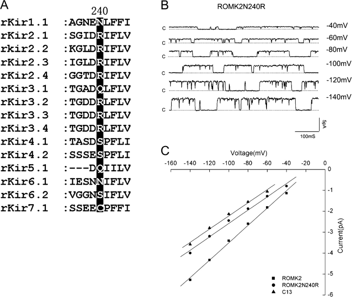 Figure 2. . Single-channel conductance of the N240R mutation. (A) Alignment of the amino acid sequences of the rat Kir channel family, showing sequence differences at positions N240. (B) Inward current traces for the mutant N240R measured in the cell-attached configuration with cell potentials of −40 to −140 mV. Dotted lines indicate the closed state and upward deflections indicate channel openings. (C) I–V relationships for N240R, N240K, and N240E, with data from ROMK2 and C13 shown for comparison. Data represent means ± SEM for at least three different patches. A minimum of 15 transitions at each voltage were measured to obtain values for each patch. The slope conductances measured between −60 and −140 mV were ROMK2, 43 pS; C13, 31 pS; and N240R, 31 pS. |