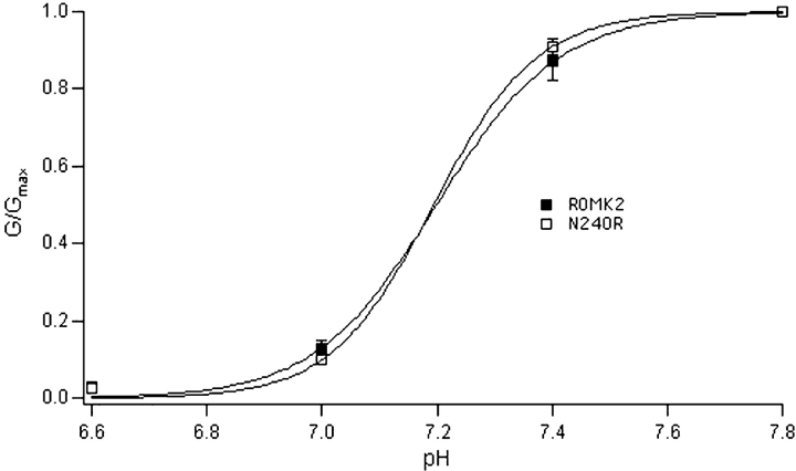 Figure 6. . pH-dependence of macroscopic currents. Oocytes were bathed in solutions containing 55 mM Kacetate. The pH of the extracellular solution was reduced in steps, and the currents were measured after a new steady-state was achieved in 10–15 min. Inward conductance was normalized to maximal values measured at pH 7.8. Data points represent means ± SEM for four oocytes. Solid lines represent best fits to a Hill equation with pKa = 7.20 and n = 4.1 (ROMK) and pKa = 7.19 and n = 4.9 (N240R). |