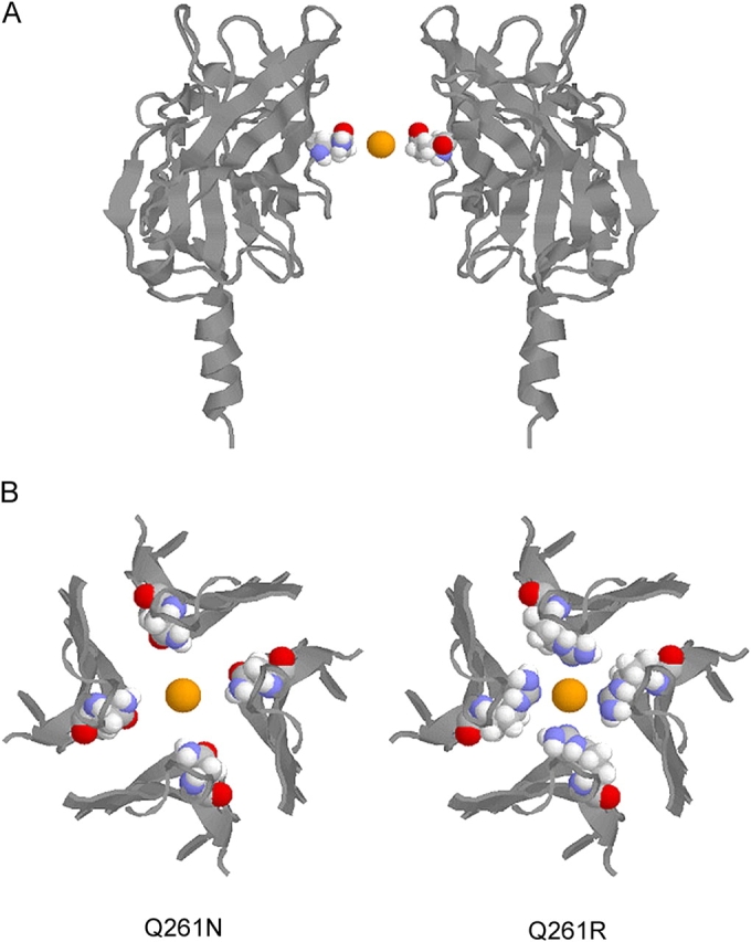 Figure 11. . Model of the effect of N to R substitution in the cytoplasmic pore based on the crystal structure of GIRK1. (A) A side view of the crystal structure of the cytoplasmic domain of GIRK1-Kir3.1 (pdb:1N9P) is shown from the side with two subunits removed for clarity. Residue Q261, corresponding to residue R260 in IRK1-Kir2.1 and N240 in ROMK2-Kir1.1 is highlighted using space-filling mode along with a potassium ion in the same plane and centered along the pore axis. (B) Models of the GIRK1 cytoplasmic domain in which residue Q261 has been mutated to asparagine (left) or arginine (right) are shown here. A cytoplasmic view of the pore-lining residues 223–230, 253–264, and 298–311 is represented with cartoon rendering except for residue 261, which is highlighted using space-filling mode. A potassium ion is shown along the central axis and in the plane of residue 261. |