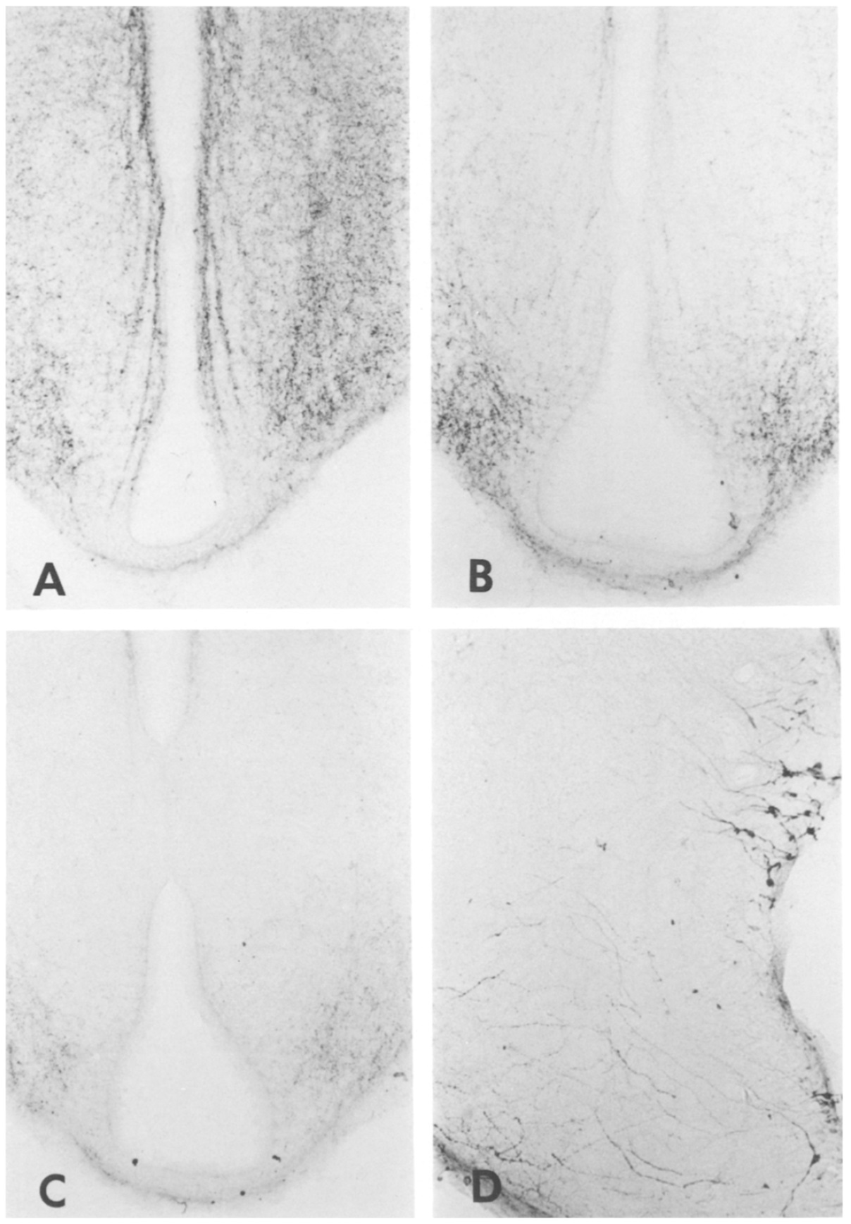 [Met5]-Enkephalin-, [Met5]-enkephalin-Arg6-, [Met5]-enkephalin-Arg6-Phe7-, metorphamide- and BAM 22P-like peptides could be localized in the amphibian brain by immunocytochemistry. However, a [Met5]-enkephalin-Arg6-Gly7-Leu8-like peptide could not be detected in the brain of any anuran species with an antiserum that was capable of detecting this octapeptide in mammalian brain. A synenkephalin-like peptide also could not be detected in the anuran brain with an antiserum that was capable of detecting the antigen in bovine and porcine brain. Although the intensity of proenkephalin-like immunoreactivity depended on the antiserum used, its distribution appeared to be identical with all of the effective antisera. Antisera directed against somatostatin and corticotropin-releasing factor stained perikarya, nerve fibers and terminals in the anuran brain with a distribution that was different from antisera directed against proenkephalin-derived peptides. The distribution of proenkephalin-containing perikarya and nerve fibers in the regions of the anuran brain selected for study showed many similarities to the distribution of proenkephalin-containing perikarya and nerve fibers in the same regions of the amniote brain.