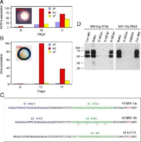 Fig. 1. Expression pattern of NRH1a and the design of NRH1 antisense morpholino oligonucleotides (MOs). (A) Expression pattern of NRH1a. RNA was extracted at the indicated stages from animal pole (AP), marginal zone (MZ) and vegetal pole (VP) regions, and the expression of NRH1a and ornithine decarboxylase (ODC) was analysed by real-time RT-PCR and normalised to levels of total RNA, with maximum observed expression defined as 100. Note significant levels of NRH1a expression in animal and vegetal pole regions. The inset shows expression of NRH1a at early gastrula stage 10 analysed by in situ hybridisation. There are high levels of NRH1a expression in the marginal zone, as previously reported (Bromley et al., 2004). (B) Expression pattern of Xbra, analysed and normalised as described for (A). Note that expression of this gene in animal pole and vegetal pole regions is lower than that of NRH1a. (C) The design of antisense morpholino oligonucleotides directed against NRH1 gene products in X. laevis and X. tropicalis. The initiating ATGs of X. laevis NRH1a and NRH1b and of X. tropicalis NRH1 are shown in red, preceded by their 5â² untranslated sequences. The sequences targeted by the indicated antisense morpholino oligonucleotides are coloured blue or green. A control MO differs by four bases (starred) from Xl MOb1. (D) Efficacies of the antisense morpholino oligonucleotides. Embryos were injected with 40 ng of the indicated MOs at one-cell stage, and 500 pg RNA encoding HA-tagged versions of NRH1a or NRH1b was injected at the two-cell stage. Embryos were cultured until mid blastula stage 8, and extracts were subjected to western blotting using an anti-HA antibody. All four X. laevis MOs block the translation of their cognate RNA while the control MO has little or no effect. |
