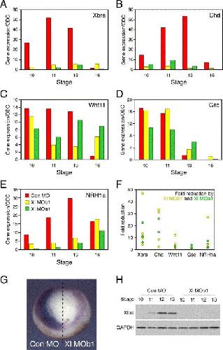 Fig. 6. Gene expression in embryos lacking NRH1 function. (AâE) Xenopus embryos were injected at the one-cell stage with 80 ng of a control MO or of Xl MOa1 or Xl MOb1. They were then assayed by real-time RT-PCR at stages 10, 11, 13 or 16 for expression of Xbra (A), Chordin (B), Xwnt11 (C), Goosecoid (D) or NRH1a (E). All values were normalised to those of ornithine decarboxylase and are presented as arbitrary units. Note that levels of Xbra, Chordin and NRH1b are substantially reduced by inhibition of NRH1 activity. (F) Scatter graphs summarising the results of four independent experiments investigating gene expression levels in embryos in which NRH1 activity is inhibited. The results show the fold reduction in gene expression caused by NRH1 MOs (such that a value of 1 would indicate no difference between control embryos and embryos injected with Xl MO1a or Xl MOb1). The ratios were calculated at the stage at which each gene was expressed at its maximum level (for example, at stage 11 for Xbra and stage 13 for Chordin). (G) Xenopus embryos were injected at the two-cell stage with 40 ng control MO into one blastomere and 40 ng Xl MOb1 into the other. The control and experimental sides of the embryos were distinguished by co-injection of 4 ng Lissamine-labelled control MO or fluorescein-labelled control MO. Embryos were allowed to develop to early gastrula stage 10 when they were analysed by in situ hybridisation using a probe specific for Xbra. Note that levels of Xbra are lower in the descendants of the blastomere injected with Xl MOb1 (right). Nine experiments of this kind have been carried out, together with five where one side of the embryo was injected with Xl MOb1 and the other left uninjected and six where one side of the embryo was injected with control MO and the other left uninjected. Only in the latter group were levels of Xbra similar in the two halves of the embryo. (H) Western blot of extracts from embryos injected at the cell stage with 80 ng of a control MO or Xl MOb1, probed with an antibody specific for Xbra (upper panel) or GAPDH (lower panel). Note that levels of Xbra are greatly reduced by inhibition of NRH1 protein function. |