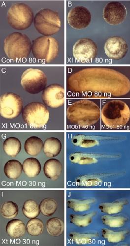 Fig. 2. Down-regulation of NRH1 proteins causes defects in gastrulation. (A) X. laevis embryos were injected at the one-cell stage with 80 ng of a control MO, or Xl MOa1 or Xl MOb1. Embryos shown are at the equivalent of neurula stage 16. Note that embryos injected with control MO develop normally, while those injected with Xl MOa1 (B) or Xl MOb1 (C) do not complete gastrulation normally. (D) Embryos injected with 40 or 80 ng Xl MOb1 as indicated, shown at the equivalent of stage 28. Embryos injected with Xl MOb1 tend to disaggregate and arrest development so as to resemble those at gastrula or neurula stages (E, F). (G) X. tropicalis embryos injected with Xt MO show a similar phenotype to that observed in X. laevis embryos. (G, H) Embryos injected with 30 ng of a control antisense morpholino oligonucleotide develop normally, while those injected with 30 ng Xt MO do not complete gastrulation normally (I) and go on to exhibit anterior and posterior truncations (J). |