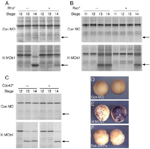 Fig. 9. Apoptosis in embryos injected with NRH1 antisense morpholino oligonucleotides is delayed or prevented by injection of RNA encoding active forms of the small GTPases Rho, Rac or Cdc42. (A) Embryos were injected at the one-cell stage with 80 ng of a control MO or of Xl MOb1 as indicated, and at the 2- to 4-cell stage, they were injected at four equatorial positions with RNA encoding constitutively active forms of Rho, Rac or Cdc42 (5, 50 and 30 pg per embryo, respectively). They were cultured to the indicated stages, and extracts were assayed for the ability to cleave tPARP. Note that the onset of caspase activity is delayed by active forms of all three small GTPases. With the exception of the experiment involving Rac, these experiments have been carried out twice, with the same results both times. (D). Inhibition of the planar cell polarity pathway, and the resulting disruption of gastrulation, does not cause dramatic apoptosis. Embryos were injected at the one-cell stage with 80 ng of a control MO (D), or with 80 ng of Xl MOb1 (E). In panel F, 3.6 ng RNA encoding Dsh-DEP+, a dose that is sufficient severely to disrupt gastrulation, was delivered by four equatorial injections made at the 2- to 4-cell stage. They were cultured to stage 14 and subjected to whole-mount TUNEL staining. Note that, in contrast to embryos injected with Xl MOb1 (E), little apoptosis occurs in embryos injected with RNA encoding Dsh-DEP+ (F). Note that the experiments in panels D were carried out at the same time as those illustrated in Figs. 8A, B, and the control embryos in Fig. 8A and panel D are identical. |