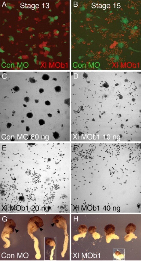 Fig. 4. Effect of loss of NRH1 function on cell spreading and convergent extension. (A, B) Cell spreading on fibronectin is not prevented by Xl MOb1, but cells detach prematurely at neurula stage 15. Embryos of X. laevis were injected at the one-cell stage with 80 ng control MO or Xl MOb1 together with fluorescein-dextran (green) or rhodamine-dextran (red), respectively. Animal caps derived from the two type of embryo were pooled, and cells were dissociated, treated with activin and seeded onto fibronectin-coated dishes. (A) Stage 13; both control cells (green) and cells lacking NRH1 activity (red) adhere to fibronectin. (B) Stage 15; control cells (green) remain adherent, but cells lacking NRH1 activity (red) detach from the substrate. (C) Loss of NRH1 function interferes with cellell adhesion. Cells derived from the animal pole regions of embryos injected at the one-cell stage with the indicated MOs were treated with activin, seeded onto a fibronectin-coated substrate and cultured to the equivalent of late neurula stage 17. Cells derived from control embryos detach from the substrate and form clumps, but those derived from embryos in which NRH1 activity is inhibited fail to aggregate in a dose-dependent manner. (G, H) Dorsal marginal zone regions (eller sandwiches derived from embryos injected with Xl MOb1 tend to shed cells and elongate only poorly. Embryos were injected at the one-cell stage with 80 ng control MO or Xl MOb1. Dorsal marginal zone regions were dissected from such embryos at early gastrula stage 10, assembled into Keller sandwiches and cultured to the equivalent of late neurula stage 18. Note the dramatic elongation of control sandwiches (G) compared with those in which NRH1 activity is inhibited (H). Note also that cement glands form in control dorsal marginal zone regions (arrowheads in G) but not those in which NRH1 function is inhibited (H). The insets in (G) and (H) show Keller sandwiches before the removal of detached cells. Note that dorsal marginal zone regions derived from embryos injected with Xl MOb1 shed many cells. |