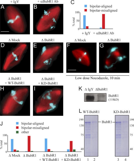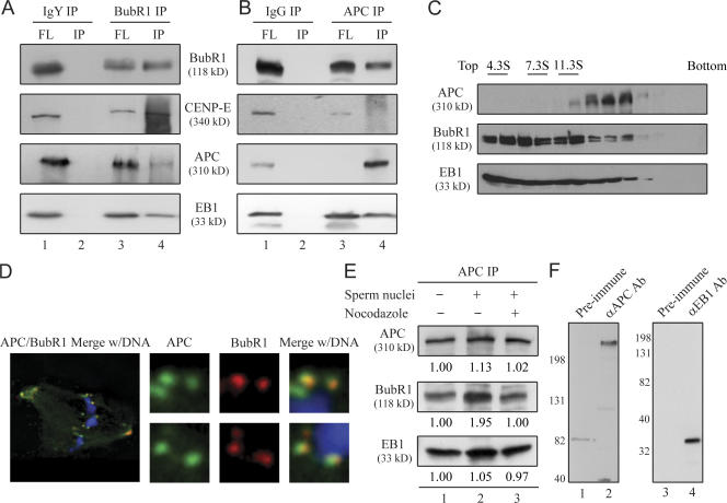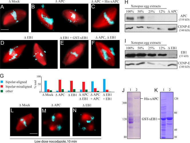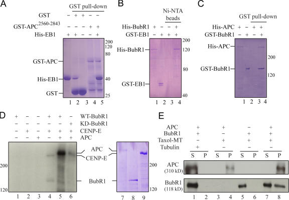 The accurate segregation of chromosomes in mitosis requires the stable attachment of microtubules to kinetochores. The details of this complex and dynamic process are poorly understood. In this study, we report the interaction of a kinetochore-associated mitotic checkpoint kinase, BubR1, with two microtubule plus end-associated proteins, adenomatous polyposis coli (APC) and EB1, providing a potential link in stable kinetochore microtubule attachment. Using immunodepletion from and antibody addition to Xenopus laevis egg extracts, we show that BubR1 and its kinase activity are essential for positioning chromosomes at the metaphase plate. BubR1 associates with APC and EB1 in egg extracts, and the complex formation is necessary for metaphase chromosome alignment. Using purified components, BubR1 directly phosphorylates APC and forms a ternary complex with APC and microtubules. These findings support a model in which BubR1 kinase may directly regulate APC function involved in stable kinetochore microtubule attachment.