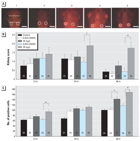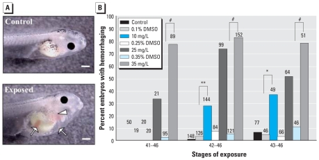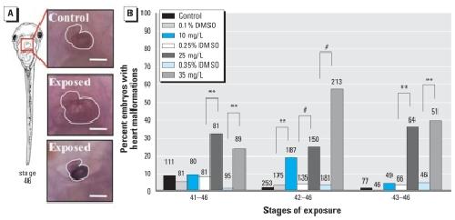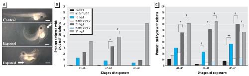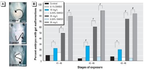 BACKGROUND: Exposure to anthropogenic chemicals during development can disrupt the morphogenesis of organ systems. Use of the herbicide atrazine has been debated in recent years because of its implicated, but poorly characterized, effects on vertebrates. Previous studies primarily examined the effects of atrazine exposure during metamorphosis or early developmental stages of amphibians. OBJECTIVES: We sought to identify and characterize the susceptibility during the often-overlooked developmental stage of organ morphogenesis. METHODS: We used a static renewal experimental treatment to investigate the effects of 10, 25, and 35 mg/L atrazine from early organ morphogenesis through the onset of tadpole feeding in the aquatic amphibian model system, Xenopus laevis. We quantified malformations of the body axis, heart, and intestine, as well as apoptosis in the midbrain and pronephric kidney. RESULTS: We found a significant dose-dependent increase in the percentage of atrazine-exposed tadpoles with malformations of multiple tissues including the main body axis, circulatory system, kidney, and digestive system. Incidence of apoptotic cells also increased in the both midbrain and kidney of atrazine-exposed tadpoles. CONCLUSIONS: Our results demonstrate that acute atrazine exposure (10-35 mg/L for < or = 48 hr) during early organ morphogenesis disrupts proper organ development in an amphibian model system. The concurrent atrazine-induced apoptosis in the pronephric kidney and midbrain begins to elucidate a mechanism by which atrazine may disrupt developmental processes in nontarget organisms.
