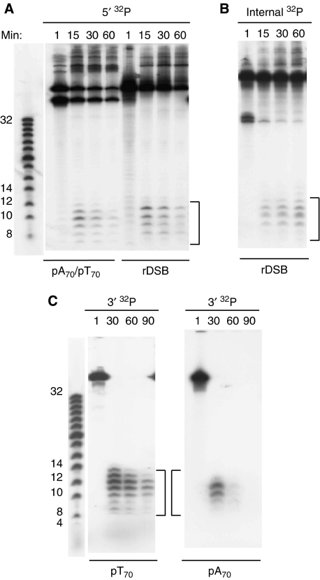 Figure 1. DNA end processing leads to generation of ssDNA oligos. (A) Different DNA structures such as rDSB and pA70/pT70 were stoichiometrically labelled at the 5′ (5′ 32P). After incubation for the indicated times in the egg extract, the DNA was recovered and ran on a 22% denaturing acrylamide gel. In (B) rDSBs were internally labelled (internal 32P) at the thirty-fifth nucleotide from the 5′ end and in (C) pT70 and pA70 were labelled at the 3′ end (3′ 32P) before incubation.