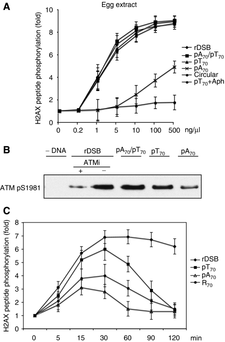 Figure 2. ATM activation by different DNA structures. (A) Histone H2AX carboxy-terminal peptide phosphorylation in the presence of increasing amounts of rDSB, pA70/pT70, pT70, pA70, M13 circular ssDNA or pT70 plus 100 μM aphidicolin (Aph). Activity was measured 15 min after incubation of DNA in the extract at 22°C and is expressed as fold induction over the activity measured in the untreated extract. (B) ATM serine 1981 phosphorylation in the untreated (âDNA) egg extract or extract supplemented with rDSB in the absence or presence of 10 μM Ku55933 (ATMi), 2.5 ng/μl pA70/pT70, pT70 or pA70 or after 30 min of incubation. Western blot was performed with Advance ECL for enhanced sensitivity. (C) Histone H2AX peptide phosphorylation in the presence of egg extract containing no DNA, 2.5 ng/μl rDSB, pT70 or 25 ng/μl pA70 and R70 measured at the indicated time points after DNA addition. Activity is expressed as fold induction. In all graphs, the values are average of three independent experiments and the error bars represent standard deviation.