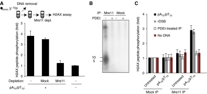 Figure 4. ssDNA oligos form DNAâprotein complexes with MRN that are able to induce ATM activation. (A) Biotinylated labelled pA70/pT70 was incubated in the extract for 30 min and following DNA removal with streptavidin beads, Mre11 was depleted and ATM activity was monitored. Activity is expressed as fold induction over the untreated samples. (B) 32P-labelled DNA isolated from Mre11 or mock immunoprecipitations was run on a 15% TBEâurea denaturing gel. Immunoprecipitates were untreated or treated with 0.001 U/μl PDEI. (C) Histone H2AX peptide phosphorylation induced by Mre11 immunoprecipitated from an untreated or a pA70/pT70-treated extract and transferred to an extract supplemented with low concentrations of pA70/pT70 (0.2 ng/μl) (black bar), rDSB (0.2 ng/μl) (grey bar) or no DNA (red bar). Immunoprecipitates were also treated with 0.001 U/μl PDEI for 10 min at 22°C before transfer into the extract supplemented with low concentrations of DNA (white bar).