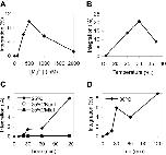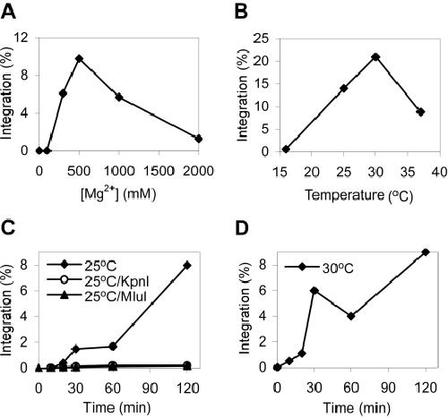 Figure 2. Determination of optimal conditions for site-specific integration of group II intron RNPs into a plasmid target site in X. laevis oocyte nuclei.(A) Mg2+-concentration dependence. Target plasmid DNA (10 ng) with 0 to 2,000 mM MgCl2 and 17 mM dNTPs was injected into X. laevis oocyte nuclei followed by Ll.LtrB lariat RNPs (50 ng). The oocytes were incubated for 2 h at 25°C. (B) Temperature dependence. Target plasmid DNA (9 ng) with 500 mM MgCl2 and 17 mM dNTPs was injected into X. laevis oocyte nuclei followed by Ll.LtrB lariat RNPs (50 ng). The oocytes were incubated for 2 h at different temperatures. (C and D) Time courses at 25°C or 30°C, respectively. Target plasmid DNA (4.5 ng) with 500 mM MgCl2 and 17 mM dNTPs was injected into X. laevis oocyte nuclei, followed by Ll.LtrB lariat RNPs (36 ng). The oocytes were incubated for the indicated times and then quick frozen on dry ice. Nucleic acids isolated from the 25°C-incubated oocytes were untreated or digested with KpnI or MluI (10 units; New England Biolabs) for 1 h at 37°C and then extracted twice with phenol-CIA and ethanol precipitated prior to electroporation into E. coli. In (A)–(D), injection volumes were 18 nl. Integration efficiencies (%) were determined by electroporating nucleic acids extracted from oocytes into E. coli HMS174(DE3), followed by plating to determine ratios of (TetR+AmpR)/AmpR colonies, as described in Figure 1 and Materials and Methods. Each experiment was repeated at least once with essentially the same results.