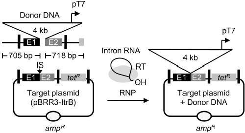 Figure 3. Assay of group II intron-RNP stimulated homologous recombination in X. laevis oocyte nuclei.A target plasmid (pBRR3-ltrB) containing the Ll.LtrB intron-insertion site (IS; ligated ltrB exon 1 and 2 sequences; E1 and E2) was co-injected into X. laevis oocyte nuclei with a 5.4-kb linear donor DNA, consisting of a 4-kb phage λ sequence with an inserted T7 promoter, flanked by 705- and 718-bp sequences homologous to those flanking the Ll.LtrB-insertion site in the target plasmid. Ll.LtrB RNPs containing the 0.9-kb Ll.LtrB-ΔORF intron and the group II intron RT were then injected into the same oocyte nuclei. A double-strand break resulting from intron RNA reverse splicing and second-strand cleavage at the Ll.LtrB target site stimulates homologous recombination, resulting in the insertion of the donor DNA containing the T7 promoter, thereby activating the tetR gene. Nucleic acids were isolated and electroporated into E. coli HMS174(DE3), and the targeting efficiency was calculated as the ratio of (TetR+AmpR)/AmpR colonies.