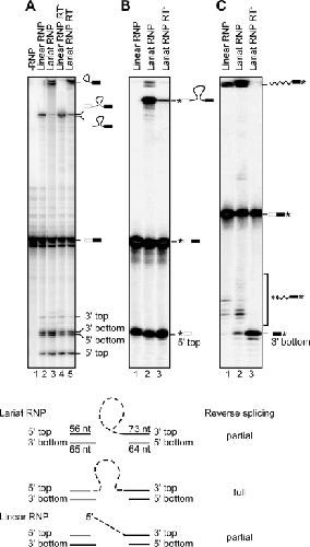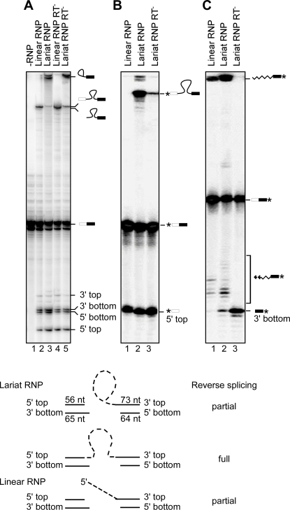 Figure 4. Target DNA cleavage and target DNA-primed reverse transcription reactions of RNPs reconstituted with lariat or linear Ll.LtrB intron RNA.Ll.LtrB RNPs containing lariat or linear intron RNA were incubated with 32P-labeled DNA oligonucleotide substrates containing the Ll.LtrB target site (positions −56 to +73 from the Ll.LtrB intron-insertion site), and the products were analyzed in a denaturing polyacrylamide gel. (A) Lariat and linear RNPs were incubated with internally labeled DNA substrate for 30 min at 37°C, as described in Materials and Methods. (B) and (C) Lariat and linear RNPs incubated with DNA substrates labeled (asterisk) at the 5′-end of the top and bottom strand, respectively in the presence of 0.2 mM dATP, dCTP, dGTP, and dTTP for 30 min at 37°C. In (A)–(C), products are indicated to the right of the gel. The schematic at the bottom diagrams the products expected for each reaction. All lanes are from the same gel, but some lanes in (A) were rearranged to appear adjacent.