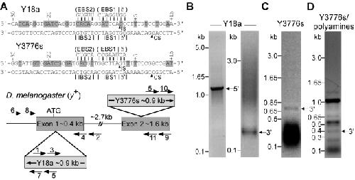 Figure 5. Site-specific integration of retargeted Ll.LtrB introns into chromosomal target sites in the Drosophila melanogaster yellow (y) gene.(A) DNA target site sequences and Ll.LtrB intron RNA base-pairing interactions for targetrons Y18a and Y3776s. Retargeted Ll.LtrB-ΔORF introns (targetrons) are denoted by a number that corresponds to the nucleotide position 5′ to the Ll.LtrB intron-insertion site numbered from the A of the ATG initiation codon, followed by “a” or “s”, indicating sense and antisense strand respectively. The DNA target sequences are shown from positions −30 to +15 from the intron-insertion site, with nucleotide residues that match those in the wild-type Ll.ltrB intron target sequence [7] highlighted in gray in the top strand. The intron-insertion site (IS) in the top strand and the IEP-cleavage site (CS) in the bottom strand are indicated by arrowheads. Below is shown a schematic of the Drosophila yellow (y) gene (NCBI accession number P09957), with the targetron-insertion sites indicated, and a diagram of the PCRs used to detect site-specific targetron insertion. y gene exons are gray rectangles, and introns and flanking sequences are lines. PCR primers used to detect and sequence the targetron integrations are indicated by numbered arrows. (B) PCR analysis of targetron Y18a integration using a double-injection protocol. Fifty embryos were injected with a solution containing 100 mM MgCl2+17 mM dNTPs followed by Y18a lariat RNPs (0.9 mg/ml). The embryos were incubated for 1 h at 30°C followed by 48 h at 18°C. Nucleic acids were isolated, and PCR products corresponding to the 5′- and 3′-junctions of Y18a integrated at its chromosomal target site (1,156-bp and 238-bp, respectively) were detected by nested PCR using the following primer pairs: 5′-junction, primers 1 (LtrB+940a) and 2 (yellow+277a), followed by primers 3 (LtrB+933a) and 4 (yellow+241a); 3′-junction, primers 5 (LtrB+788s) and 6 (yellow-350a), followed by primers 7 (LtrB+880s) and 8 (yellow-160s) (see Materials and Methods). (C) PCR analysis of targetron Y3776s integration using a double-injection protocol. Forty embryos were injected with 100 mM MgCl2 followed by Y3776s lariat RNPs (1.3 mg/ml), and the embryos were then incubated for 30 min at 37°C. Nucleic acids were isolated, and a 702-bp PCR product corresponding to the 3′-junction of Y3776s integrated at its target site was detected by PCR using primers 5 (LtrB+788s) and 9 (yellow+4325a) (see Materials and Methods). The dark band at the bottom of the gel is RNA. (D) PCR analysis of Y3776s integration using a single-injection protocol. Thirty embryos were injected with a solution containing100 mM KCl, 5 mM putrescine dihydrochloride, 3 mM spermidine trihydrochloride, 1 mM spermine tetrahydrochoride, 5 mM MgCl2, and Y3776s linear RNPs (0.5 mg/ml). After incubating the embryos for 30 min at 37°C, nucleic acids were isolated as described above, and a 348-bp PCR product (arrow) corresponding to the 3′-junction for Y3776s integrated at its target site was detected by nested PCR using primers 5 (LtrB+788s) and 9 (yellow+4325a), followed by primers 10 (LtrB+870s) and 11 (yellow+4054a) (see Materials and Methods). Other bands in the gel are likely due to non-specific annealing of the primers. In (B–D), the PCR products were analyzed by electrophoresis in a 1% agarose gel, which was stained with ethidium bromide, and the identities of the PCR products were confirmed by sequencing across the integration junctions (not shown).