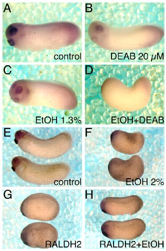 Fig. 2. Manipulation of ALDH activity modulates the EtOH-induced phenotype. Embryos were subjected to different manipulations of ALDH activity in combination with EtOH treatment. Embryos were allowed to develop to early tailbud stages (st. 29) and were analyzed further by in situ hybridization with the XAG1 (cement gland) and Pax6 (eyes and midbrain) probes. (A) Control embryo; at the early tailbud stage, the developing cement gland, eyes and midbrain are clearly discernible as the stained areas to the left of the image. (B) Partial ALDH inhibition with 20 μM DEAB. (C) Low EtOH (1.3%) treatment. (D) Combined EtOH and DEAB treatment. (E) Control embryos. (F) Embryos treated with 2% EtOH. (G) Embryos overexpressing Raldh2. (H) Rescue of the EtOH effect by overexpression of Raldh2.