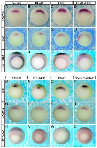 Fig. 5. Manipulation of RALDH modulates the effect of EtOH on gene expression domains during gastrulation. Sensitization to EtOH exposure by RALDH knockdown was shown by using DEAB to enhance the sensitivity to EtOH. Embryos were analyzed by in situ hybridization during early/mid gastrula stages (st. 10.5). Embryos were hybridized with the chordin (AâD,QâT), gsc (EâH,MâP) and Cyp26A1 (IâL,UâX) probes. (A,E,I) Control embryos. (B,F,J) DEAB-treated (20 μM) embryos. (C,G,K) Embryos exposed to EtOH (1.5%). (D,H,L) Combined treatment with DEAB and EtOH shows enhanced sensitivity to the EtOH exposure. Rescue of the EtOH effect was achieved by Raldh2 overexpression. (M,Q,U) Control embryos. (N,R,V) Embryos injected with Raldh2 mRNA. (O,S,W) EtOH-treated (1.5%) embryos. (P,T,X) Raldh2 overexpression rescues the EtOH-induced effects.