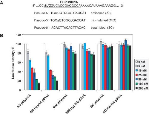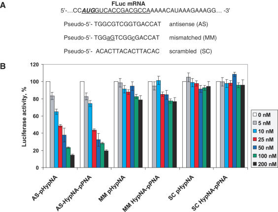 Figure 3. Dose-dependent inhibition of firefly luciferase translation in vitro by the mimic antisense oligomers targeted against the translational start site of FLuc mRNA. (A) Sequences of HypNA-pPNA and pHypNA oligomers designed to target the FLuc mRNA; (B) Analysis of firefly luciferase translation inhibition by the oligomers. Firefly luciferase activity was calculated relative to the activity in the absence of any oligomer and normalized respect to Renilla luciferase production.