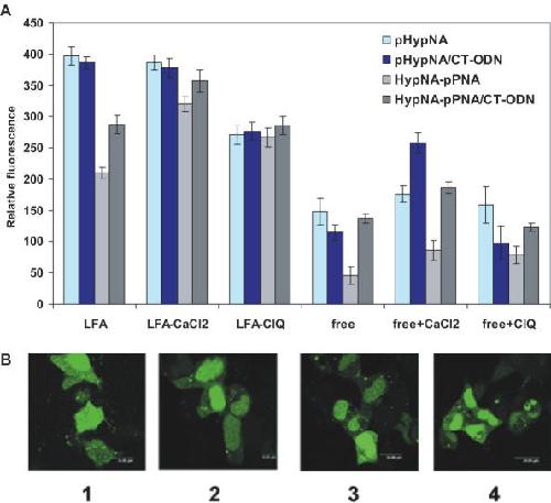 Figure 4. Cellular uptake and intracellular distribution of the fluorescein-labeled mimic oligomers (TCACTCAACACTCAC-Flu). (A) Fluorescent analysis of the delivery of oligomers (1 µM) into Phoenix Eco cells performed 20 h after the treatment under various delivery conditions: in the presence, or in the absence, of LFA, 6 mM CaCl2, and 100 µM chloroquine (ClQ). (B) Confocal microscopy images of the pHypNA oligomer uptake after 20 h incubated with unfixed Phoenix Eco cells in the presence of: LFA (1); LFA/6mM Ca2+ (2); CT-ODN/LFA (3) and LFA/100 µM ClQ (4).