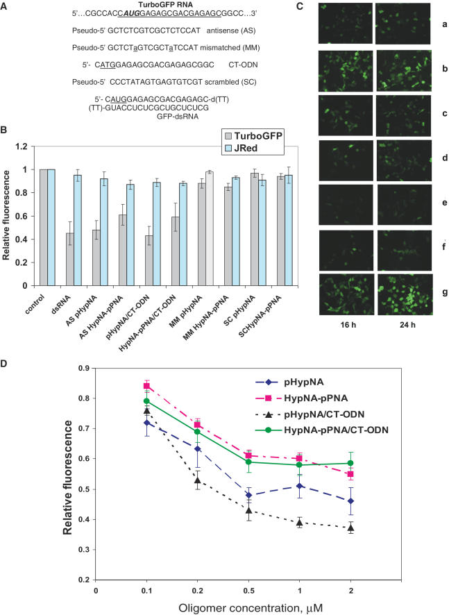 Figure 5. Analysis of the reduction of TurboGFP levels by antisense mimic oligomers in Phoenix Eco cells transfected with p2FP-RNAi vector. Co-transfection of oligomers was performed in the presence of LFA. The cells transformed with the vector alone were analyzed as controls. (A) Sequences of oligomers designed to target the translational start site of the TurboGFP mRNA. (B) Analysis of green and red fluorescence intensity of the cells treated with 0.5 µM oligomers, or with 0.2 µM dsRNA, after 24 h. The average data of three separate experiments are shown. (C) Fluorescent microscopy images of the cells transfected with p2FP-RNAi and treated with 0.5 µM mimic oligomer samples for 16 and 24 h. Panels show examples of cells treated with 0.2 µM dsRNA (a); mismatched pHypNA oligomer (b); duplex of antisense pHypNA oligomer with CT-ODN (c); duplex of antisense HypNA-pPNA oligomer with CT-ODN (d); antisense pHypNA oligomer (e) and antisense HypNA-pPNA oligomer (f). Panel (g) shows cells untreated with oligomers. (D) Effect of the antisense oligomer concentration on the TurboGFP production in cells. Fluorescence was measured 24 h after the transfection. Average data points from three independent experiments are shown.