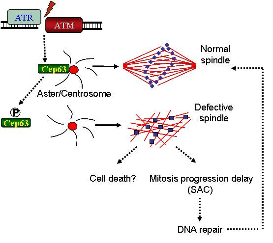 Figure 1. Proposed model: ATM and ATR mediated XCEP63 phosphorylation promotes its removal from centrosome delaying spindle assembly. Depending on the number of DNA breaks this can lead to mitotic progression delay or mitotic cell death.