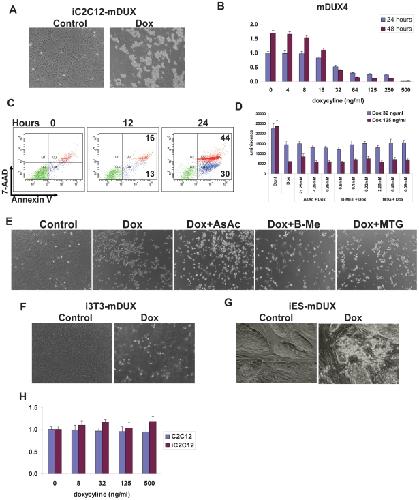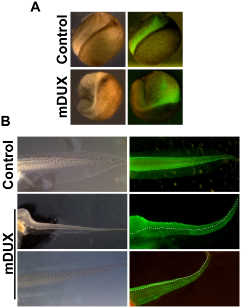 Facioscapulohumeral muscular dystrophy (FSHD) is caused by contractions of D4Z4 repeats at 4q35.2 thought to induce misregulation of nearby genes, one of which, DUX4, is actually localized within each repeat. A conserved ORF (mDUX), embedded within D4Z4-like repeats, encoding a double-homeodomain protein, was recently identified on mouse chromosome 10. We show here that high level mDUX expression induces myoblast death, while low non-toxic levels block myogenic differentiation by down-regulating MyoD and Myf5. Toxicity and MyoD/Myf5 expression changes were competitively reversed by overexpression of Pax3 or Pax7, implying mechanistic similarities with the anti-myogenic activity of human DUX4. We tested the effect of mDUX expression on Xenopus development, and found that global overexpression led to abnormalities in gastrulation. When targeted unilaterally into blastomeres fated to become tail muscle in 16-cell embryos, mDUX caused markedly reduced tail myogenesis on the injected side. These novel cell and animal models highlight the myopathic nature of sequences within the FSHD-related repeat array.