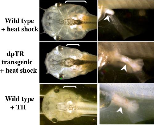 Fig. 4. TR is sufficient to mediate the metamorphic effects of TH. Wild type tadpoles and sibling tadpoles transgenic for a dominant positive TR (dpTR) under the control of a heat shock-inducible promoter were reared together in methimazole to block endogenous T3 synthesis and were heat-shocked daily for 8 days. For comparison, wild type tadpoles were treated with TH for 3 days. Note that the heat shock induction of dpTR expression resulted in metamorphic events, including gill resorption (bracket) and limb outgrowth (arrowhead) in the transgenic (middle) but not wild type (top) animals, just like TH-treatment of wild type sibling animals (bottom) (Buchholz et al., 2004).