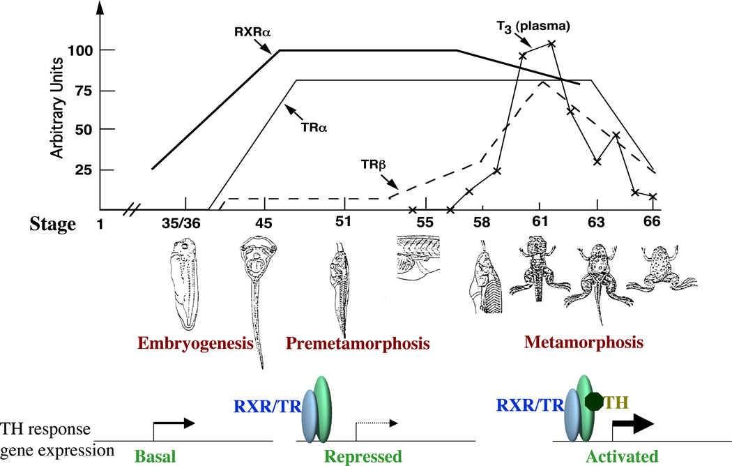 ???displayArticle.abstract??? Thyroid hormone (TH) affects diverse biological processes and can exert its effects through both gene regulation via binding the nuclear TH receptors (TRs) and non-genomic actions via binding to cell surface and cytoplasmic proteins. The critical importance of TH in vertebrate development has long been established, ranging from the formation of human cretins to the blockage of frog metamorphosis due the TH deficiency. How TH affects vertebrate development has been difficult to study in mammals due to the complications associated with the uterus-enclosed mammalian embryos. Anuran metamorphosis offers a unique opportunity to address such an issue. Using Xenopus as a model, we and others have shown that the expression of TRs and their heterodimerization partners RXRs (9-cis retinoic acid receptors) correlates temporally with metamorphosis in different organs in two highly related species, Xenopuslaevis and Xenopus tropicalis. In vivo molecular studies have shown that TR and RXR are bound to the TH response elements (TREs) located in TH-inducible genes in developing tadpoles of both species. More importantly, transgenic studies in X. laevis have demonstrated that TR function is both necessary and sufficient for mediating the metamorphic effects of TH. Thus, the non-genomic effects of TH have little or no roles during metamorphosis and likely during vertebrate development in general.