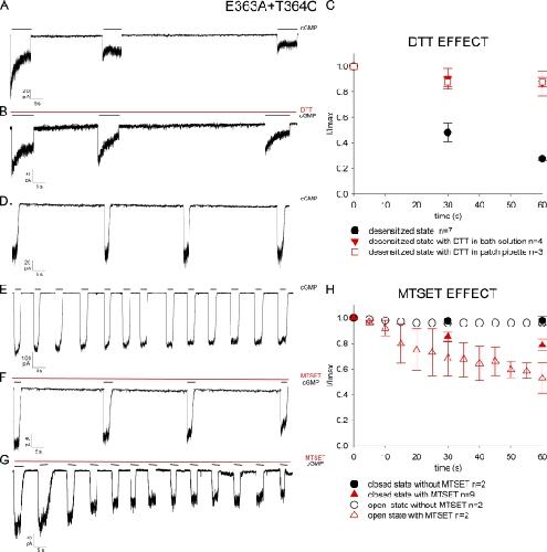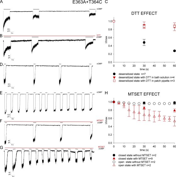 Figure 2. State-dependent modification of the mutant channel E363A+T364C. cGMP-activated current traces at +60 mV in three different conformations of mutant channel: desensitized (A), closed (D), and open (E) states. (B) Effect of 5 mM DTT added to patch pipette solution in desensitized conformation of channel. (F and G) Effect of 2.5 mM MTSET added to the extracellular medium in closed (F) and open (G) states. 1 mM cGMP, 5 mM DTT, and 2.5 mM MTSET was added as indicated by the solid horizontal black or red bars. (C) Comparison of 5 mM DTT added to bath solution (red solid triangle), in patch pipette (red open square), and in DTT absence (black solid circle) in desensitized state; the values represent the amplitude of the peak current (I) measured every 30 s and normalized (I/Imax) to peak current of control (Imax) at time zero. (H) State-dependent modification in the closed (black solid circle) and open (black open circle) states in the absence of 2.5 mM MTSET, and in closed (red solid triangle) and open (red open triangle) states in the presence of 2.5 mM MTSET in the extracellular medium. Single points of the plots represent the amplitude of the peak current (I) measured every 5 s in open state and 30 s in closed state and, as in C, normalized (I/Imax) to peak current of control (Imax) at time zero. |