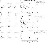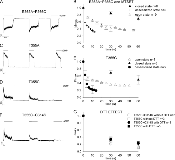 Figure 3. Desensitization in mutant channels E363A+P366C, T355A, T355C, and T355C+C314S. cGMP-activated current traces in the desensitized state of four mutant channels: E363A+P366C (A) at −60 mV, T355A (C), T355C (D), and T355C+C314S (F) at +60 mV. 1 mM cGMP was added as indicated by the solid horizontal black bars. (B) State-dependent modification in closed (solid triangle), open (open triangle), and desensitized (plus) states of mutant channel E363A+P366C in the presence of 2.5 mM MTSET. The plot shows the state-dependent modification calculated from the amplitude of the peak current (I) every 30 s in the closed state and 5 s in the open state, whereas in the desensitized state the values of current were measured from the peak (I) to the steady state (I) every 2 s. The values were normalized (I/Imax) to the peak current of control (Imax) at time zero. (E) State-dependent modification in closed (solid triangle), open (open triangle), and desensitized (solid circle) states for mutant channel T355C in the absence of 2.5 mM MTSET. The values of current were measured as in B. (G) Comparison of mutant channels T355C and T355C+C314S in desensitizing state in the absence (black open circle and square) and in the presence (black solid circle and square) of 5 mM DTT applied to bath solution. Symbols represent the amplitude of the peak current (I) measured every 30 s for both mutant channels and normalized (I/Imax) to peak current of control (Imax) at time zero. |