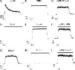 Figure 4. Recovery from desensitization in double-mutant channels. cGMP-activated currents in the presence of 1 mM cGMP at +60 mV in mutant channels L356C (A), F380C (B), L356C+F380C (C), L356F (D), F380L (E), L356F+F380L (F), L356D (G), F380K (H), and L356D+F380K (I). cGMP was added as indicated by the solid horizontal bars. |