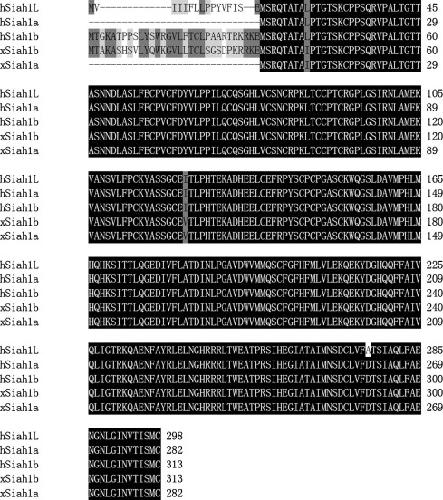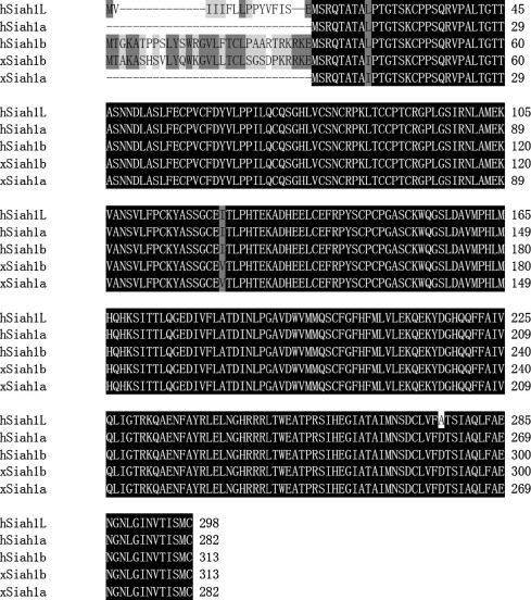 Sequence comparison of the alternative splicing variants of Siah1 among human and frog. hSiah1L (EAW82726), hSiah1b (NP_001006611), hSiah1a (NP_003022), xSiah1a and xSiah1b.