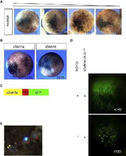 xSiah1a suppresses Xenopus embryocleavage through a proteosome dependent degradation pathway. (A) Overexpression of xSiah1a suppresses Xenopus embryocleavage in a dose-dependent manner. (B) Two hundred picograms xSiah1a mRNA injection compared to 2 ng xSiah1b mRNA injection. (C) Schematic representation of the construct of xSiah1a-2A-GFP. (D) Expression of XSiah1a was suppressed by MG132, a proteosome inhibitor. MG132 was injected to embryos after injection of 500 pg of xSiah1a-2A-GFP mRNA. (E) Overexpression of xSiah1a formed multinuclear cells. Red arrow shows an enlarged nucleus; yellow arrow indicates a normal nucleus. (For interpretation of the references to color in this figure legend, the reader is referred to the web version of this article.)